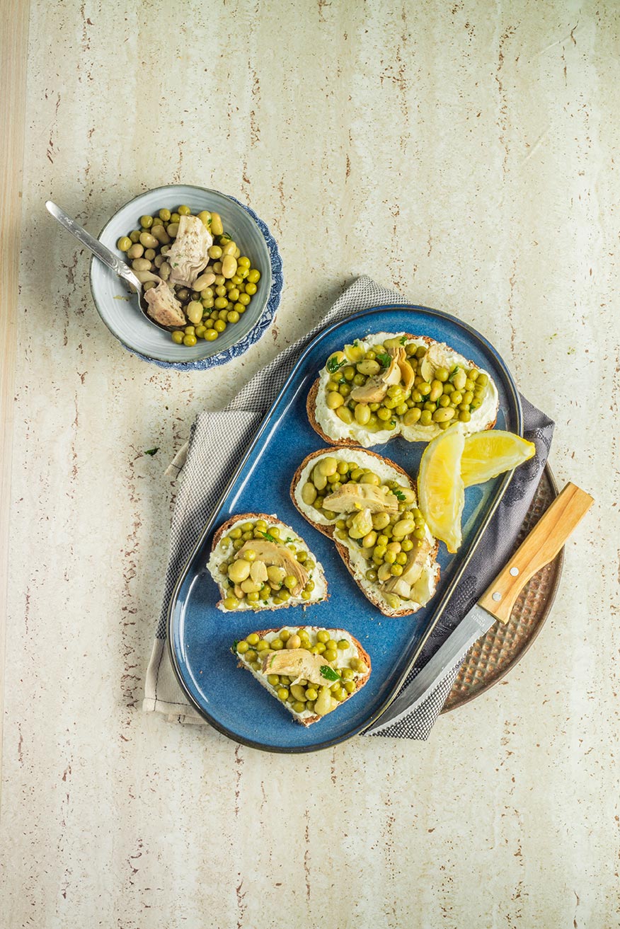 Crostini con crema di robiola, edamame, carciofini, e piselli
