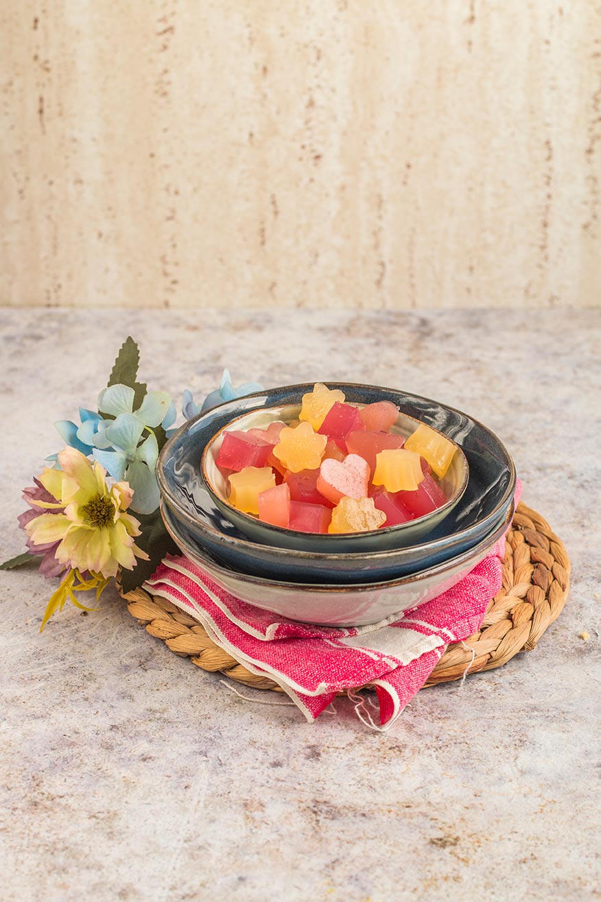 L’utilizzo dell’amido di mais rende le gelatine più morbide e meno gommose. Lo sciroppo di mela esalta la dolcezza naturale della frutta ma le gelatine possono essere preparate anche senza o riducendone il quantitativo.