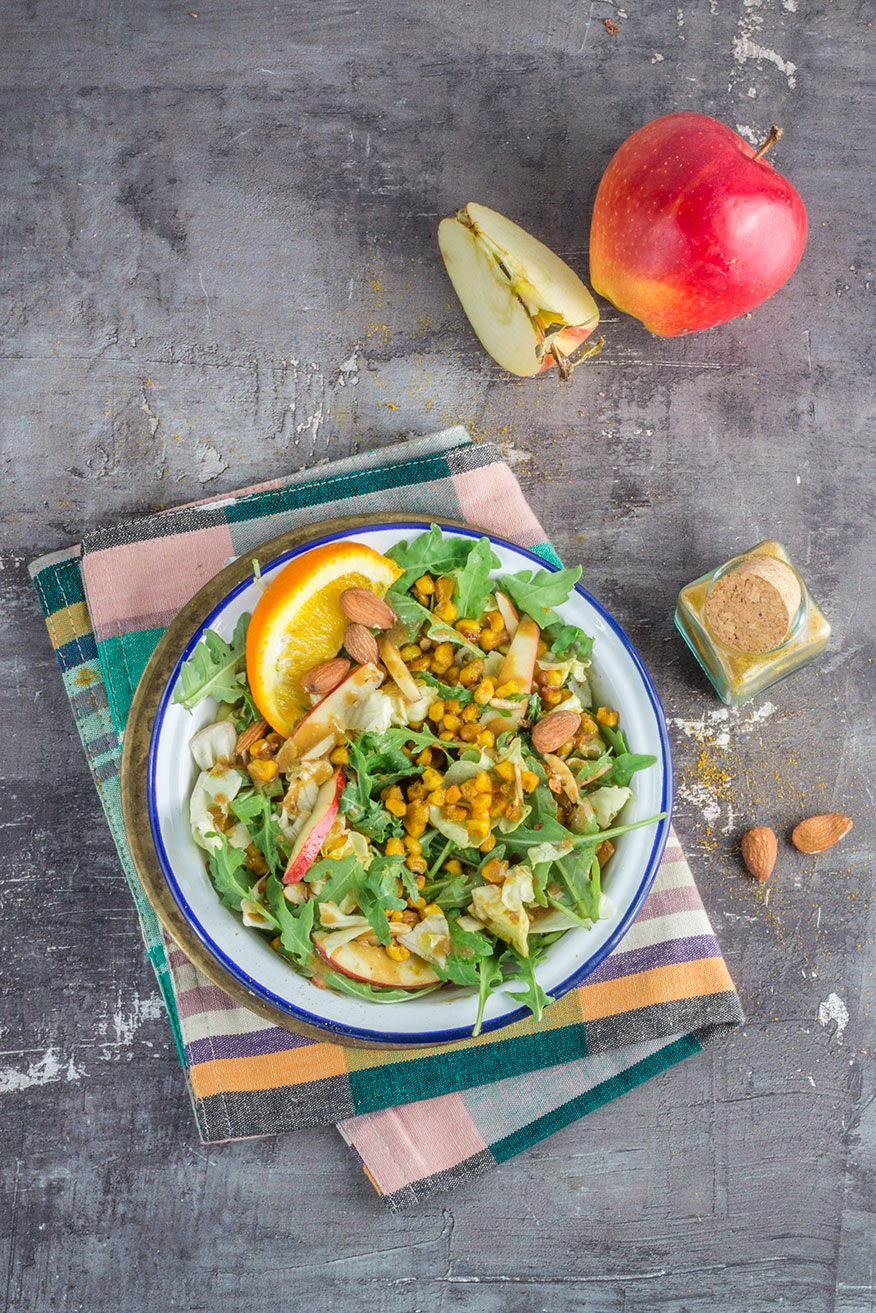 Scolate il mais e tamponatelo con lo scottex, passatelo in un mix di farina paprika, curry sale e pepe. Distribuite il mais in una teglia ricoperta di carta forno e cospargete con un filo di olio. Cuocete in forno a 180°C per 15 minuti fino a leggera doratura. Nel frattempo lavate la lattuga e tagliatela a strisce e mettetela in una ciotola, unite la rucola, la mela tagliata a bastoncini, le mandorle tritate e il mais tostato. Preparate il condimento lavorando assieme tutti gli ingredienti e cospargete sull’insalata, mescolate e servite.