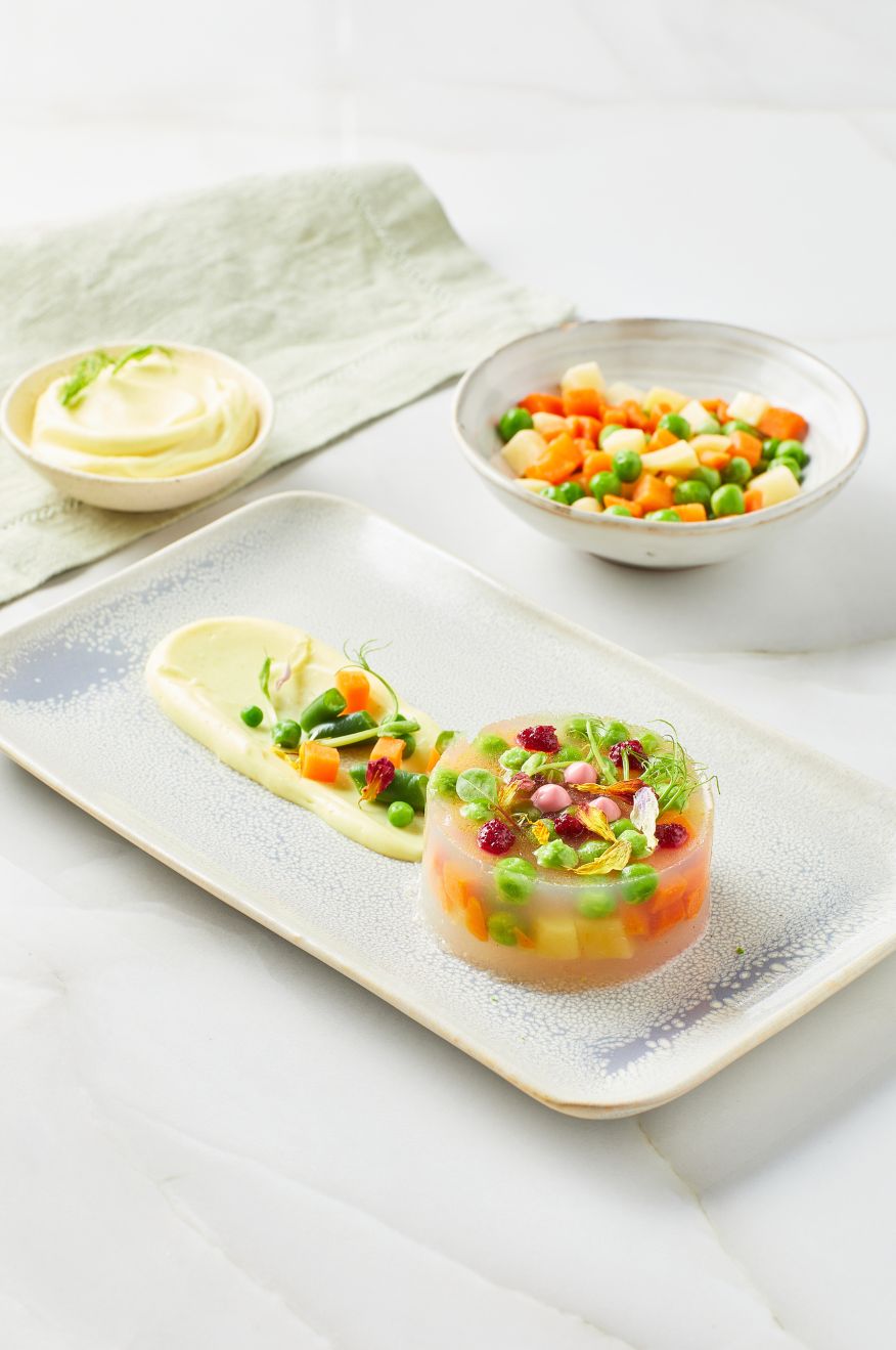 Seguite la fantasia per l’impiattamento: estraete l’aspic di verdure dallo stampino, con molta attenzione a non romperlo,e ponetelo sul piatto, decorate la superficie con le salse, alternando i colori, erbette e fiori eduli. Ponete una generosa porzione di mayo 100% vegetale e completate con le verdure condite a crudo.